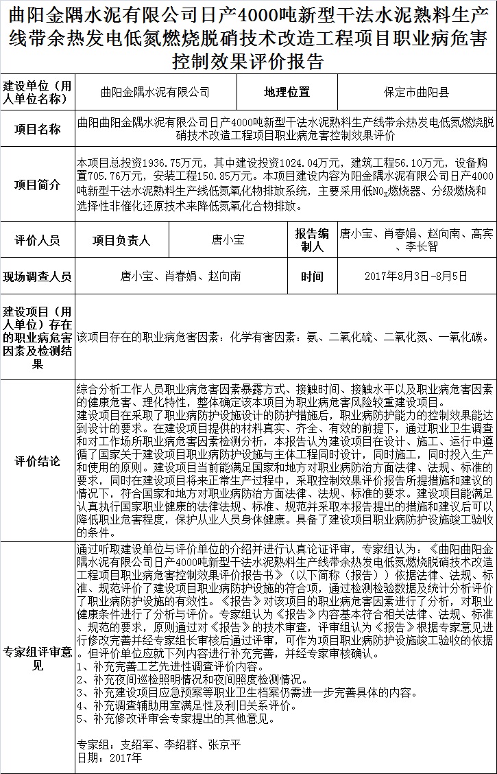 曲阳金隅水泥有限公司日产4000吨新型干法水泥熟料生产线带余热发电项目低氮燃烧烧脱硝技术改造项目职业病危害控制效果评价
